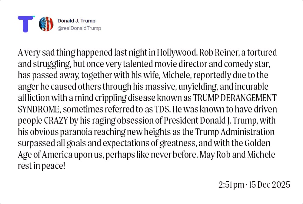 Compassion – even the illusion of it – is officially out in many circles of American life. Cruelty and vileness are in. Supporters are now on X/Twitter justifying Trump’s attack. One person sniped how actor and director Ron Howard never said anything about nice Charlie Kirk the way he did about Reiner, his friend and colleague (also, not a racist or a misogynist). Another had this rationalization about Trump’s words: “[Trump] was almost murdered... twice. It’s personal.” Obviously a reference to the two people who tried to take Trump’s life in 2024, when Reiner wasn’t even using X/Twitter anymore.