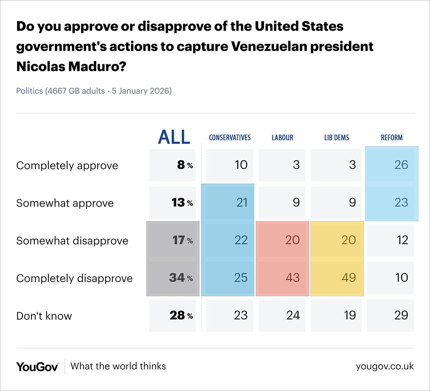 - Reform UK (49%) – Cheerleaders. The only group where a plurality backs the US raid, viewing it as decisive action against a socialist pariah.